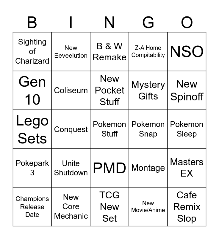This bingo card has a free space and 24 words: Unite Shutdown, New Core Mechanic, New Pocket Stuff, Champions Release Date, NSO, Sighting of Charizard, Gen 10, New Eeveelution, Pokemon Snap, PMD, Mystery Gifts, Lego Sets, Montage, Masters EX, Coliseum, New Movie/Anime, Pokemon Sleep, B & W Remake, New Spinoff, Conquest, Cafe Remix Slop, Pokepark 3, Z-A Home Compitability and TCG New Set.
