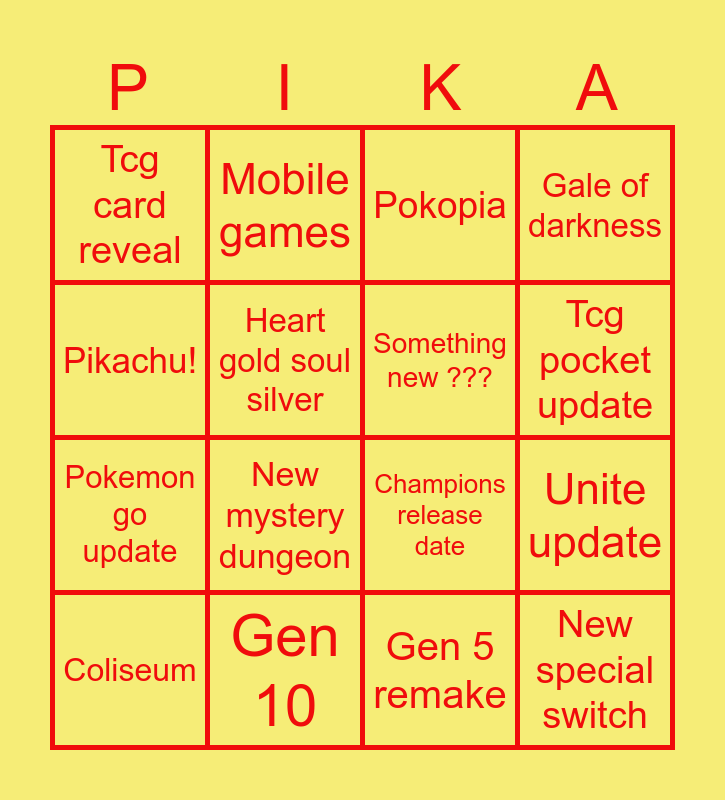 This bingo card has 16 words: Gen 10, Unite update, Pokopia, Tcg card reveal, Pokemon go update, Mobile games, Champions release date, Gen 5 remake, Pikachu!, Heart gold soul silver, Coliseum, Gale of darkness, New mystery dungeon, Tcg pocket update, Something new ??? and New special switch.