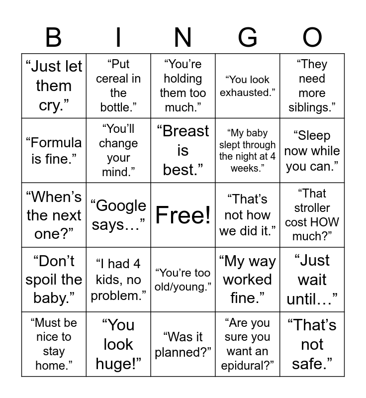 This bingo card has a free space and 28 words: “Just wait until…”, “If you think you’re tired now…”, “My baby slept through the night at 4 weeks.”, “Are you sure you want an epidural?”, “Formula is fine.”, “You’re holding them too much.”, “Put cereal in the bottle.”, “Don’t spoil the baby.”, “That’s not how we did it.”, “Must be nice to stay home.”, “When’s the next one?”, “You look exhausted.”, “You look huge!”, “Was it planned?”, “Sleep now while you can.”, “You think that’s hard?”, “I had 4 kids, no problem.”, “You’ll change your mind.”, “Breast is best.”, “You’re too old/young.”, “Just let them cry.”, “You’ll miss this stage.”, “That’s not safe.”, “Google says…”, “That stroller cost HOW much?”, “My way worked fine.”, “They need more siblings.” and “You’re doing it wrong.”.