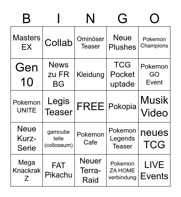 This bingo card has a free space and 24 words: gamcube teile (colloseum), FAT Pikachu, Kleidung, Mega Knackrak Z, Pokemon Champions, Masters EX, Gen 10, Collab, Pokopia, Pokemon Cafe, TCG Pocket uptade, Pokemon UNITE, Pokemon Legends Teaser, neues TCG, News zu FR BG, Pokemon ZA HOME verbindung, Musik Video, Ominöser Teaser, Pokemon GO Event, Legis Teaser, LIVE Events, Neue Kurz-Serie, Neue Plushes and Neuer Terra-Raid.