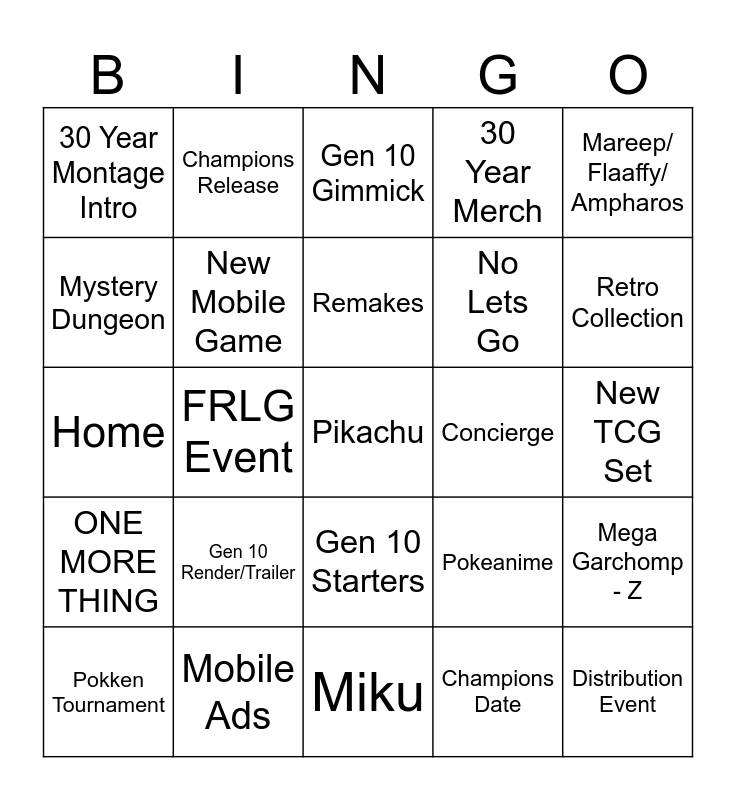 This bingo card has a free space and 24 words: Gen 10 Render/Trailer, Mobile Ads, Remakes, Pokken Tournament, Mareep/ Flaaffy/ Ampharos, 30 Year Montage Intro, Mystery Dungeon, Champions Release, Concierge, Gen 10 Starters, No Lets Go, Home, Pokeanime, Mega Garchomp - Z, New Mobile Game, Champions Date, New TCG Set, Gen 10 Gimmick, Retro Collection, FRLG Event, Distribution Event, ONE MORE THING, 30 Year Merch and Miku.