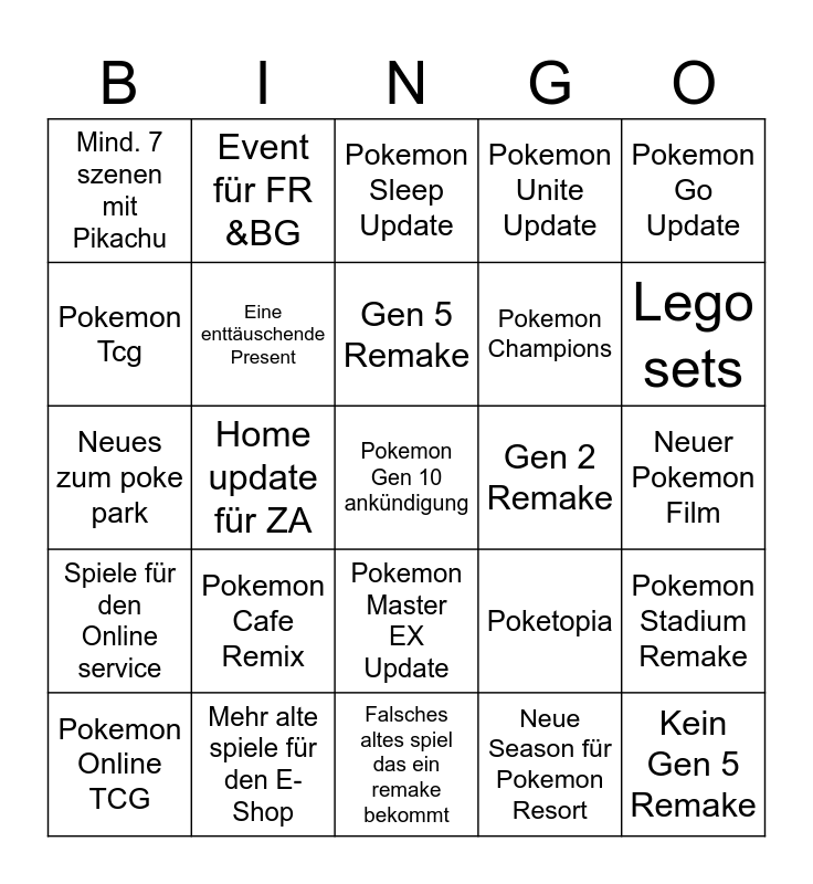 This bingo card has a free space and 24 words: Pokemon Cafe Remix, Mehr alte spiele für den E-Shop, Gen 5 Remake, Pokemon Online TCG, Pokemon Go Update, Mind. 7 szenen mit Pikachu, Pokemon Tcg, Event für FR &BG, Gen 2 Remake, Pokemon Master EX Update, Pokemon Champions, Neues zum poke park, Poketopia, Pokemon Stadium Remake, Eine enttäuschende Present, Neue Season für Pokemon Resort, Neuer Pokemon Film, Pokemon Sleep Update, Lego sets, Home update für ZA, Kein Gen 5 Remake, Spiele für den Online service, Pokemon Unite Update and Falsches altes spiel das ein remake bekommt.