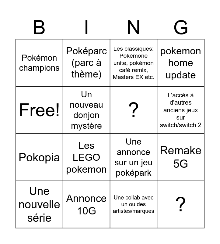 This bingo card has 16 words: Annonce 10G, Remake 5G, Les classiques: Pokémone unite, pokémon café remix, Masters EX etc., Pokémon champions, Pokopia, Poképarc (parc à thème), Une annonce sur un jeu poképark, Une collab avec un ou des artistes/marques, Free!, Un nouveau donjon mystère, Une nouvelle série, pokemon home update, Les LEGO pokemon, L'accès à d'autres anciens jeux sur switch/switch 2, ? and ?.