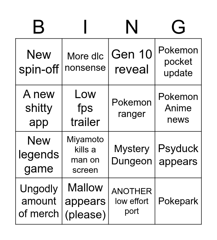 This bingo card has 16 words: Mallow appears (please), Psyduck appears, Gen 10 reveal, New spin-off, New legends game, More dlc nonsense, Mystery Dungeon, ANOTHER low effort port, A new shitty app, Low fps trailer, Ungodly amount of merch, Pokemon pocket update, Miyamoto kills a man on screen, Pokemon Anime news, Pokemon ranger and Pokepark.