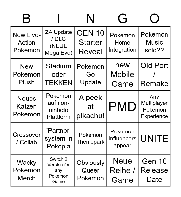 This bingo card has a free space and 24 words: "Partner" system in Pokopia, Switch 2 Version for any Pokemon Game, Pokemon Go Update, Wacky Pokemon Merch, Pokemon Music sold??, New Live-Action Pokemon, New Pokemon Plush, ZA Update / DLC (NEUE Mega Evo), PMD, Pokemon Themepark, new Mobile Game, Neues Katzen Pokemon, Pokemon Influencers appear, UNITE, Stadium oder TEKKEN, Neue Reihe / Game, Any Multiplayer Pokemon Experience, GEN 10 Starter Reveal, Old Port / Remake, Pokemon auf non-nintedo Plattform, Gen 10 Release Date, Crossover / Collab, Pokemon Home Integration and Obviously Queer Pokemon.