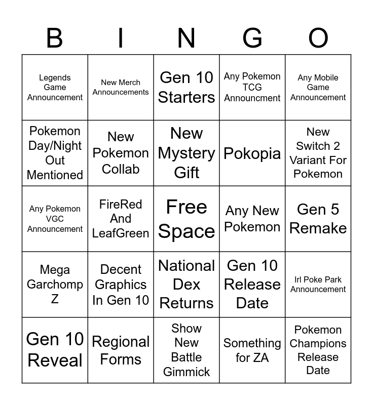 This bingo card has a free space and 24 words: Gen 10 Reveal, Decent Graphics In Gen 10, New Mystery Gift, Something for ZA, Any Mobile Game Announcement, Legends Game Announcement, New Merch Announcements, Gen 10 Starters, Any New Pokemon, Gen 5 Remake, Any Pokemon VGC Announcement, New Pokemon Collab, Gen 10 Release Date, Irl Poke Park Announcement, Pokemon Day/Night Out Mentioned, Regional Forms, Show New Battle Gimmick, Any Pokemon TCG Announcment, New Switch 2 Variant For Pokemon, Mega Garchomp Z, FireRed And LeafGreen, National Dex Returns, Pokopia and Pokemon Champions Release Date.