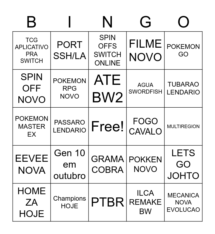 This bingo card has a free space and 24 words: Gen 10 em outubro, Champions HOJE, ATE BW2, HOME ZA HOJE, POKEMON GO, TCG APLICATIVO PRA SWITCH, SPIN OFF NOVO, PORT SSH/LA, FOGO CAVALO, GRAMA COBRA, AGUA SWORDFISH, POKEMON MASTER EX, POKKEN NOVO, LETS GO JOHTO, POKEMON RPG NOVO, ILCA REMAKE BW, MULTIREGION, SPIN OFFS SWITCH ONLINE, TUBARAO LENDARIO, PASSARO LENDARIO, MECANICA NOVA EVOLUCAO, EEVEE NOVA, FILME NOVO and PTBR.