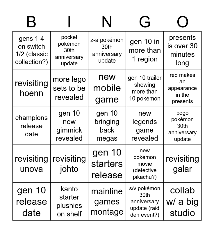 This bingo card has 25 words: revisiting johto, mainline games montage, new mobile game, gen 10 release date, presents is over 30 minutes long, gens 1-4 on switch 1/2 (classic collection?), revisiting hoenn, pocket pokémon 30th anniversary update, new legends game revealed, gen 10 starters release, gen 10 trailer showing more than 10 pokémon, champions release date, new pokémon movie (detective pikachu?), revisiting galar, more lego sets to be revealed, collab w/ a big studio, pogo pokémon 30th anniversary update, z-a pokémon 30th anniversary update, red makes an appearance in the presents, gen 10 new gimmick revealed, gen 10 bringing back megas, kanto starter plushies on shelf, revisiting unova, gen 10 in more than 1 region and s/v pokémon 30th anniversary update (raid den event?).
