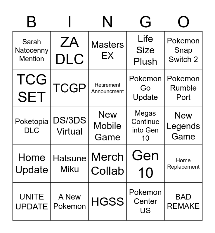 This bingo card has 25 words: Hatsune Miku, HGSS, Retirement Announcment, UNITE UPDATE, Pokemon Snap Switch 2, Sarah Natocenny Mention, TCG SET, ZA DLC, Megas Continue into Gen 10, Merch Collab, Pokemon Go Update, Poketopia DLC, Gen 10, Home Replacement, TCGP, BAD REMAKE, New Legends Game, Masters EX, Pokemon Rumble Port, DS/3DS Virtual, New Mobile Game, A New Pokemon, Home Update, Life Size Plush and Pokemon Center US.