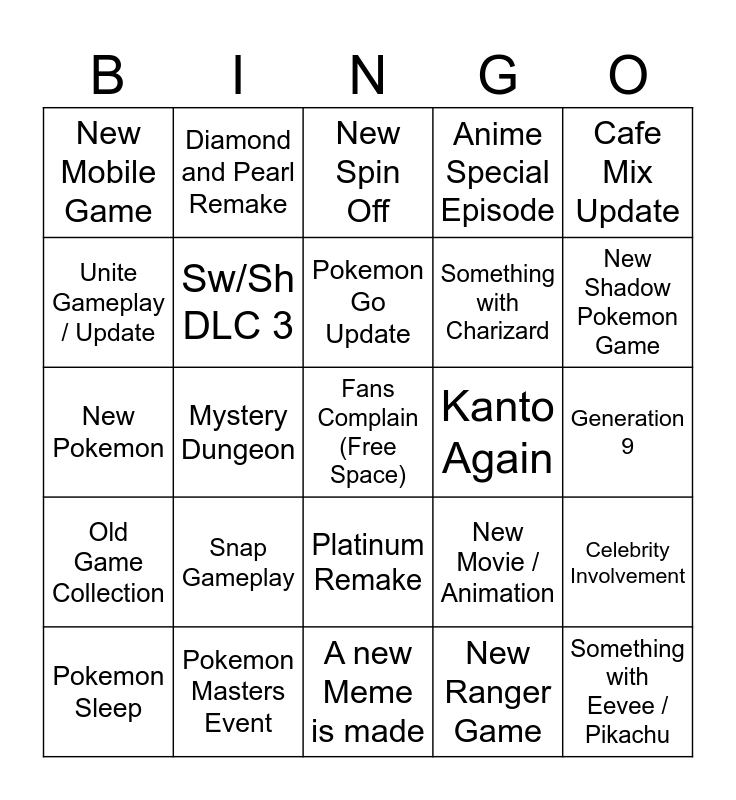 This bingo card has a free space and 24 words: Snap Gameplay, Pokemon Masters Event, Pokemon Go Update, Pokemon Sleep, Cafe Mix Update, New Mobile Game, Unite Gameplay / Update, Diamond and Pearl Remake, Kanto Again, Platinum Remake, Something with Charizard, New Pokemon, New Movie / Animation, Celebrity Involvement, Sw/Sh DLC 3, New Ranger Game, Generation 9, New Spin Off, New Shadow Pokemon Game, Mystery Dungeon, Something with Eevee / Pikachu, Old Game Collection, Anime Special Episode and A new Meme is made.