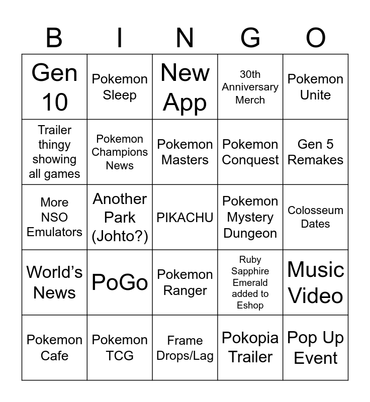 This bingo card has a free space and 24 words: PoGo, Pokemon TCG, Pokemon Masters, Pokemon Cafe, Pokemon Unite, Gen 10, Trailer thingy showing all games, Pokemon Sleep, Pokemon Mystery Dungeon, Pokemon Ranger, Pokemon Conquest, More NSO Emulators, Ruby Sapphire Emerald added to Eshop, Music Video, Pokemon Champions News, Pokopia Trailer, Colosseum Dates, New App, Gen 5 Remakes, Another Park (Johto?), Pop Up Event, World’s News, 30th Anniversary Merch and Frame Drops/Lag.