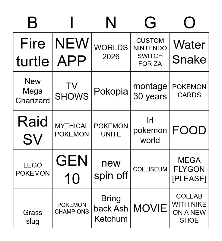 This bingo card has a free space and 24 words: GEN 10, POKEMON CHAMPIONS, Pokopia, Grass slug, Water Snake, Fire turtle, New Mega Charizard, NEW APP, Irl pokemon world, new spin off, montage 30 years, Raid SV, COLLISEUM, MEGA FLYGON [PLEASE], TV SHOWS, MOVIE, FOOD, WORLDS 2026, POKEMON CARDS, MYTHICAL POKEMON, COLLAB WITH NIKE ON A NEW SHOE, LEGO POKEMON, CUSTOM NINTENDO SWITCH FOR ZA and Bring back Ash Ketchum.