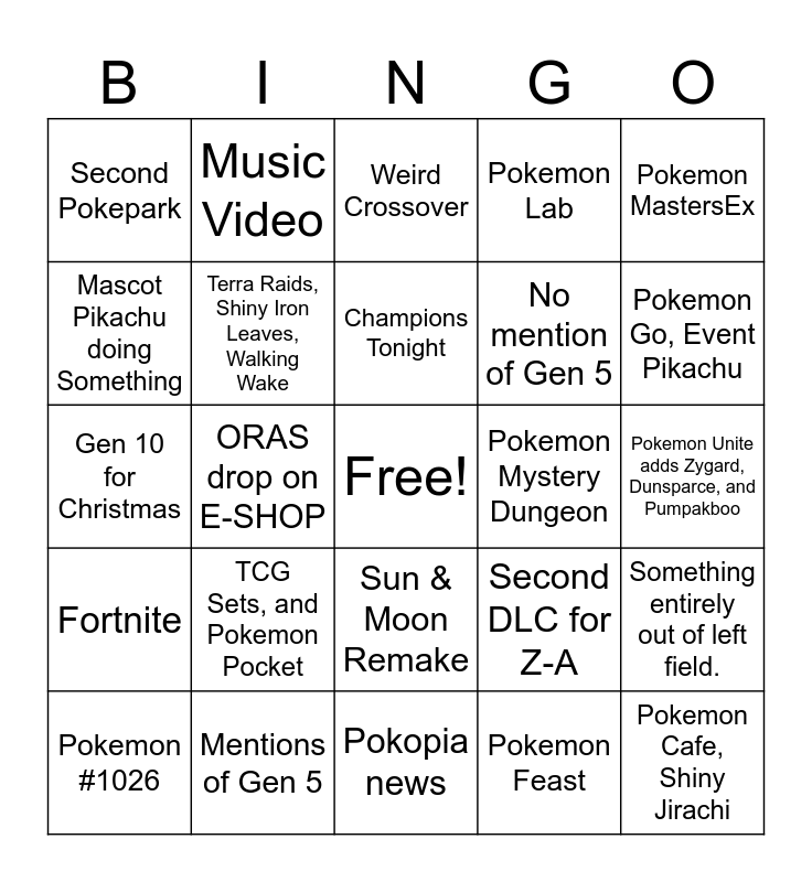 This bingo card has a free space and 24 words: TCG Sets, and Pokemon Pocket, Mentions of Gen 5, Champions Tonight, Pokemon #1026, Pokemon MastersEx, Second Pokepark, Mascot Pikachu doing Something, Music Video, Pokemon Mystery Dungeon, Sun & Moon Remake, No mention of Gen 5, Gen 10 for Christmas, Second DLC for Z-A, Something entirely out of left field., Terra Raids, Shiny Iron Leaves, Walking Wake, Pokemon Feast, Pokemon Unite adds Zygard, Dunsparce, and Pumpakboo, Weird Crossover, Pokemon Go, Event Pikachu, ORAS drop on E-SHOP, Pokemon Cafe, Shiny Jirachi, Fortnite, Pokemon Lab and Pokopia news.