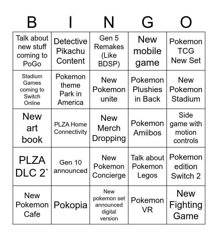 This bingo card has a free space and 24 words: Gen 10 announced, Pokopia, New Pokemon unite, New Pokemon Cafe, Pokemon TCG New Set, Talk about new stuff coming to PoGo, Stadium Games coming to Switch Online, Detective Pikachu Content, Pokemon Amiibos, New Pokemon Concierge, Pokemon Plushies in Back, New art book, Talk about Pokemon Legos, Pokemon edition Switch 2, Pokemon theme Park in America, Pokemon VR, Side game with motion controls, Gen 5 Remakes (Like BDSP), New Pokemon Stadium, PLZA Home Connectivity, New Fighting Game, PLZA DLC 2`, New mobile game and New pokemon set announced digital version.