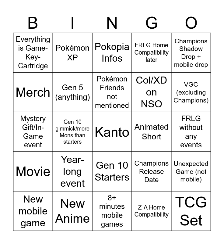 This bingo card has a free space and 24 words: Year-long event, New Anime, Pokémon Friends not mentioned, New mobile game, Champions Shadow Drop + mobile drop, Everything is Game-Key-Cartridge, Merch, Pokémon XP, Animated Short, Gen 10 Starters, Col/XD on NSO, Mystery Gift/In-Game event, Champions Release Date, Unexpected Game (not mobile), Gen 5 (anything), Z-A Home Compatibility, FRLG without any events, Pokopia Infos, VGC (excluding Champions), Gen 10 gimmick/more Mons than starters, TCG Set, Movie, FRLG Home Compatibility later and 8+ minutes mobile games.