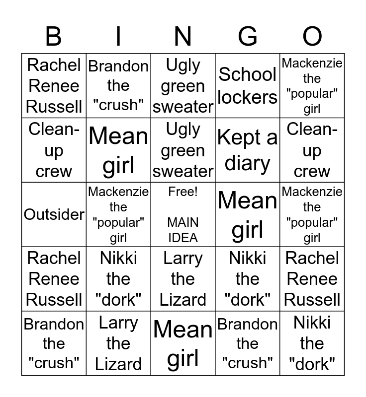 ⚠ This card has duplicate items: Nikki the "dork" (3), Larry the Lizard (2), Ugly green sweater (2), Brandon the "crush" (3), Mackenzie the "popular" girl (3), Rachel Renee Russell (3), Clean-up crew (2), Mean girl (3)
