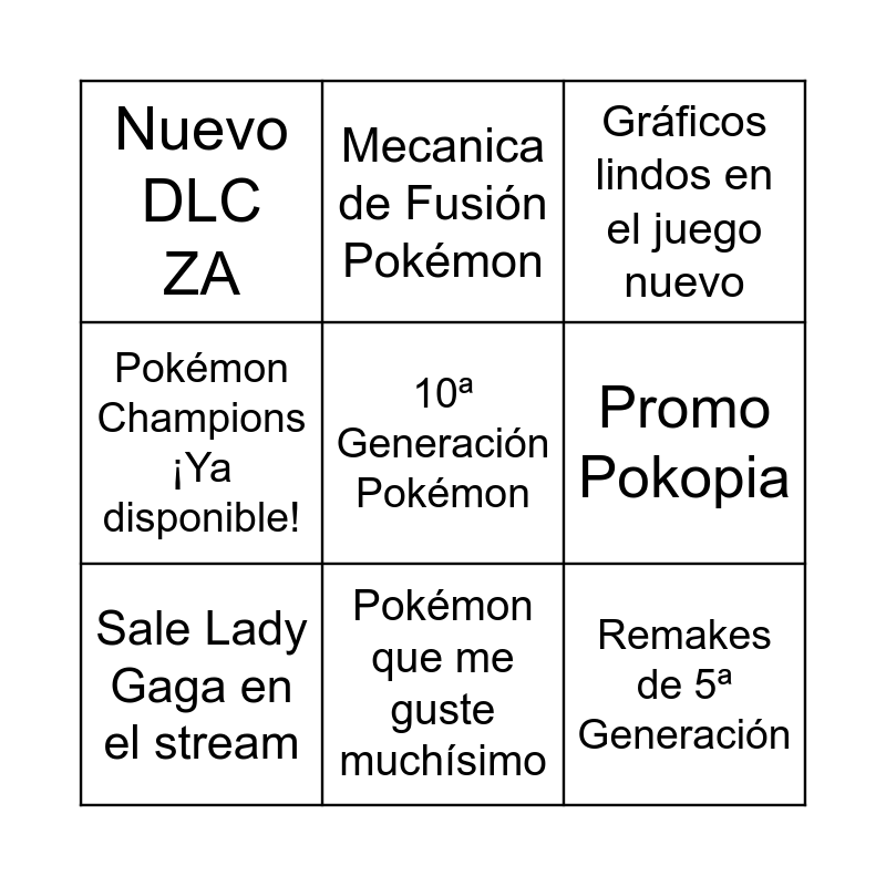 This bingo card has a free space and 8 words: Promo Pokopia, Gráficos lindos en el juego nuevo, Mecanica de Fusión Pokémon, Sale Lady Gaga en el stream, Nuevo DLC ZA, Remakes de 5ª Generación, Pokémon Champions ¡Ya disponible! and Pokémon que me guste muchísimo.