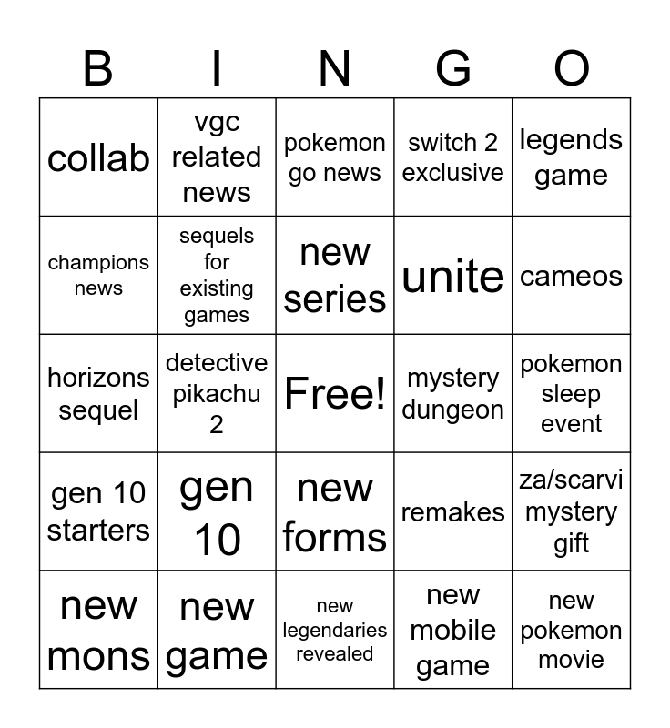 This bingo card has a free space and 24 words: gen 10, new game, new series, new mons, legends game, collab, champions news, vgc related news, mystery dungeon, new forms, unite, horizons sequel, remakes, za/scarvi mystery gift, sequels for existing games, new mobile game, pokemon sleep event, pokemon go news, cameos, detective pikachu 2, new pokemon movie, gen 10 starters, switch 2 exclusive and new legendaries revealed.