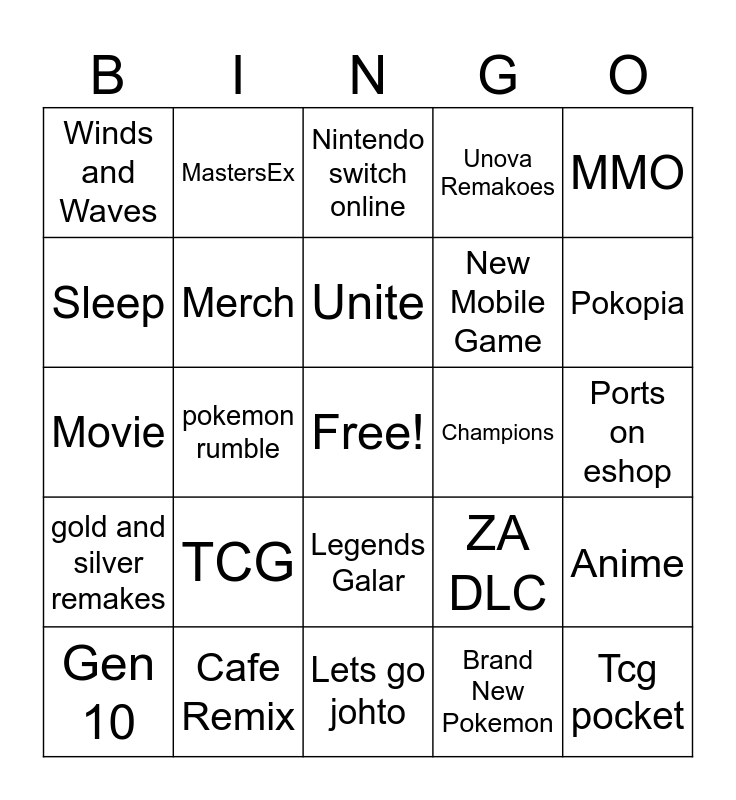 This bingo card has a free space and 24 words: TCG, Cafe Remix, Unite, Gen 10, MMO, Winds and Waves, Sleep, MastersEx, Champions, Legends Galar, New Mobile Game, Movie, ZA DLC, Anime, Merch, Brand New Pokemon, Ports on eshop, Nintendo switch online, Pokopia, pokemon rumble, Tcg pocket, gold and silver remakes, Unova Remakoes and Lets go johto.