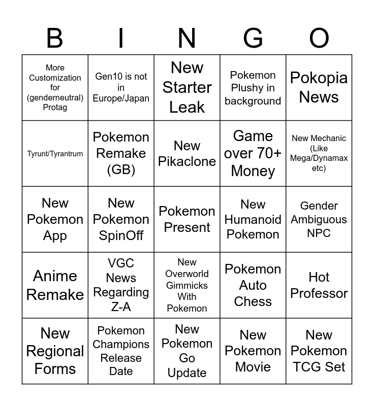 This bingo card has a free space and 24 words: VGC News Regarding Z-A, Pokemon Champions Release Date, New Pikaclone, New Regional Forms, Pokopia News, More Customization for (genderneutral) Protag, Tyrunt/Tyrantrum, Gen10 is not in Europe/Japan, New Humanoid Pokemon, New Overworld Gimmicks With Pokemon, Game over 70+ Money, New Pokemon App, Pokemon Auto Chess, Hot Professor, Pokemon Remake (GB), New Pokemon Movie, Gender Ambiguous NPC, New Starter Leak, New Mechanic (Like Mega/Dynamax etc), New Pokemon SpinOff, New Pokemon TCG Set, Anime Remake, Pokemon Plushy in background and New Pokemon Go Update.
