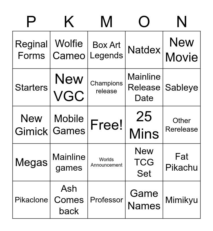 This bingo card has a free space and 24 words: Mainline games, Ash Comes back, Champions release, Pikaclone, New Movie, Reginal Forms, Starters, Wolfie Cameo, 25 Mins, Worlds Announcement, Mainline Release Date, New Gimick, New TCG Set, Fat Pikachu, New VGC, Game Names, Other Rerelease, Box Art Legends, Sableye, Mobile Games, Mimikyu, Megas, Natdex and Professor.