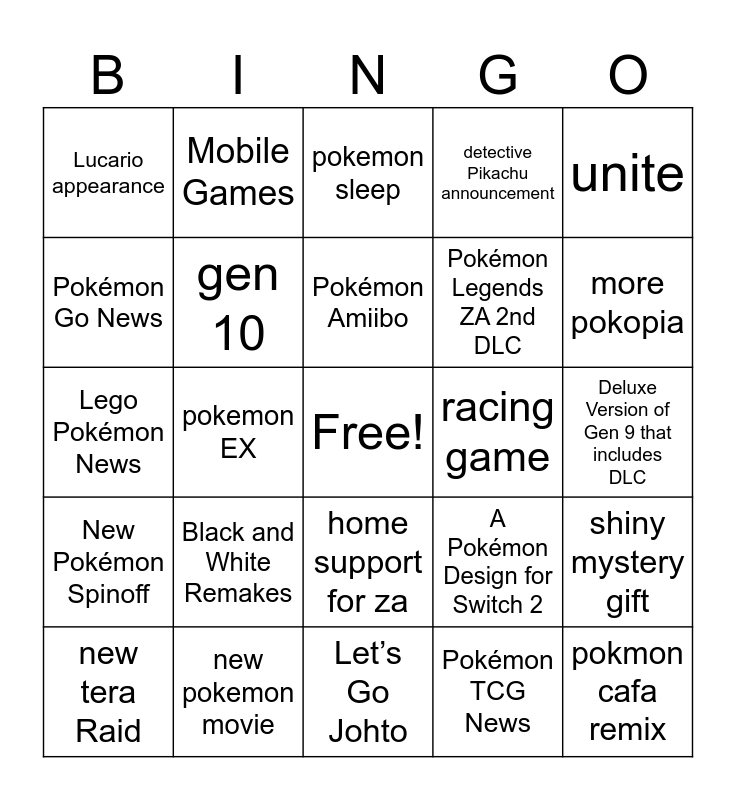 This bingo card has a free space and 24 words: Black and White Remakes, new pokemon movie, Pokémon Amiibo, new tera Raid, unite, Lucario appearance, Pokémon Go News, Mobile Games, racing game, home support for za, Pokémon Legends ZA 2nd DLC, Lego Pokémon News, A Pokémon Design for Switch 2, shiny mystery gift, gen 10, Pokémon TCG News, Deluxe Version of Gen 9 that includes DLC, pokemon sleep, more pokopia, pokemon EX, pokmon cafa remix, New Pokémon Spinoff, detective Pikachu announcement and Let’s Go Johto.