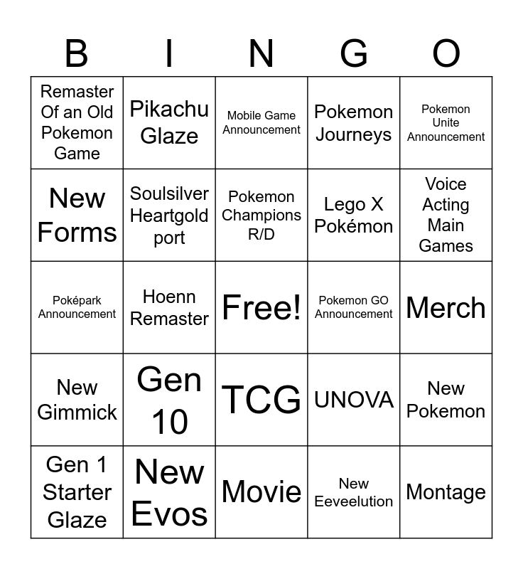 This bingo card has a free space and 24 words: Gen 1 Starter Glaze, Gen 10, Pokemon Champions R/D, New Eeveelution, Pokemon Unite Announcement, Remaster Of an Old Pokemon Game, Pikachu Glaze, Mobile Game Announcement, Pokemon GO Announcement, Merch, Poképark Announcement, Soulsilver Heartgold port, UNOVA, New Pokemon, New Forms, New Evos, Movie, Pokemon Journeys, Voice Acting Main Games, New Gimmick, Hoenn Remaster, TCG, Lego X Pokémon and Montage.