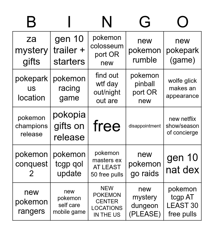 This bingo card has a free space and 24 words: pokemon tcgp qol update, new pokemon self care mobile game, find out wtf day out/night out are, new pokemon rangers, new pokepark (game), za mystery gifts, pokepark us location, gen 10 trailer + starters, disappointment, pokemon masters ex AT LEAST 50 free pulls, pokemon pinball port OR new, pokemon champions release, new pokemon go raids, gen 10 nat dex, pokemon racing game, new mystery dungeon (PLEASE), new netflix show/season of concierge, pokemon colosseum port OR new, wolfe glick makes an appearance, pokopia gifts on release, pokemon tcgp AT LEAST 30 free pulls, pokemon conquest 2, new pokemon rumble and NEW POKEMON CENTER LOCATIONS IN THE US.