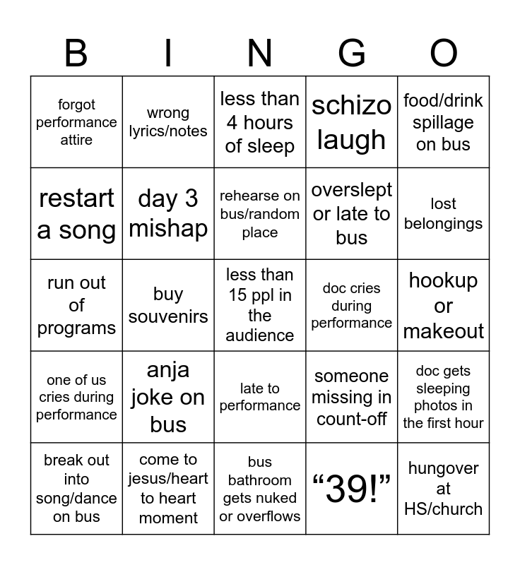 This bingo card has 25 words: anja joke on bus, bus bathroom gets nuked or overflows, rehearse on bus/random place, break out into song/dance on bus, food/drink spillage on bus, forgot performance attire, restart a song, wrong lyrics/notes, doc cries during performance, late to performance, overslept or late to bus, run out of programs, someone missing in count-off, doc gets sleeping photos in the first hour, day 3 mishap, hungover at HS/church, hookup or makeout, less than 4 hours of sleep, lost belongings, buy souvenirs, less than 15 ppl in the audience, come to jesus/heart to heart moment, one of us cries during performance, schizo laugh and “39!”.