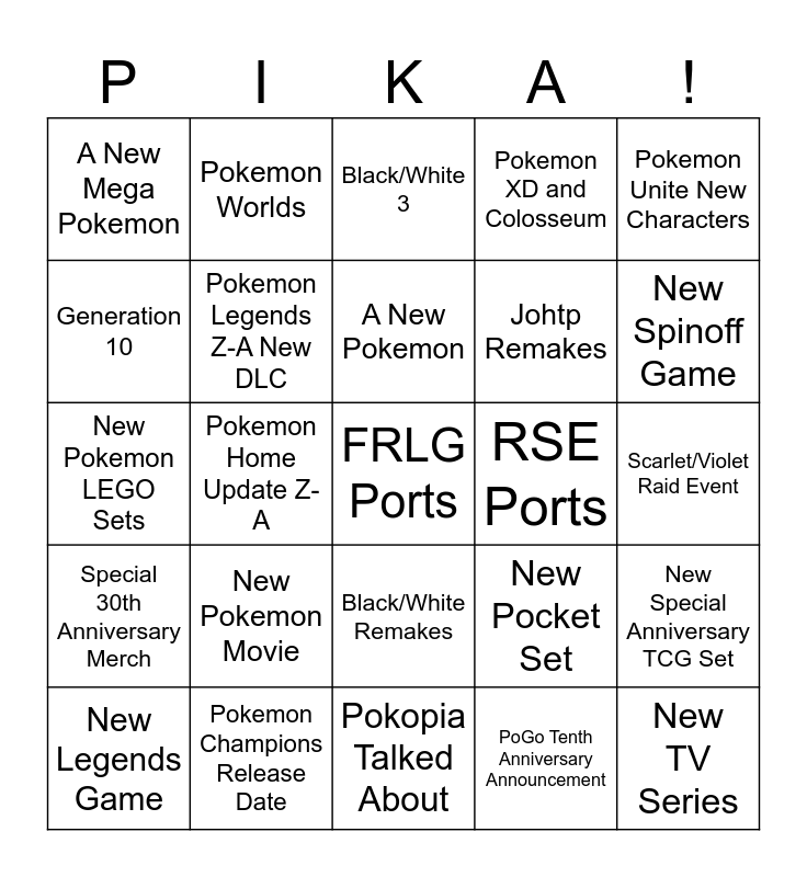 This bingo card has a free space and 24 words: New Pokemon Movie, Pokemon Champions Release Date, A New Pokemon, New Legends Game, Pokemon Unite New Characters, A New Mega Pokemon, Generation 10, Pokemon Worlds, RSE Ports, Black/White Remakes, Johtp Remakes, New Pokemon LEGO Sets, New Pocket Set, New Special Anniversary TCG Set, Pokemon Legends Z-A New DLC, PoGo Tenth Anniversary Announcement, Scarlet/Violet Raid Event, Black/White 3, New Spinoff Game, Pokemon Home Update Z-A, New TV Series, Special 30th Anniversary Merch, Pokemon XD and Colosseum and Pokopia Talked About.