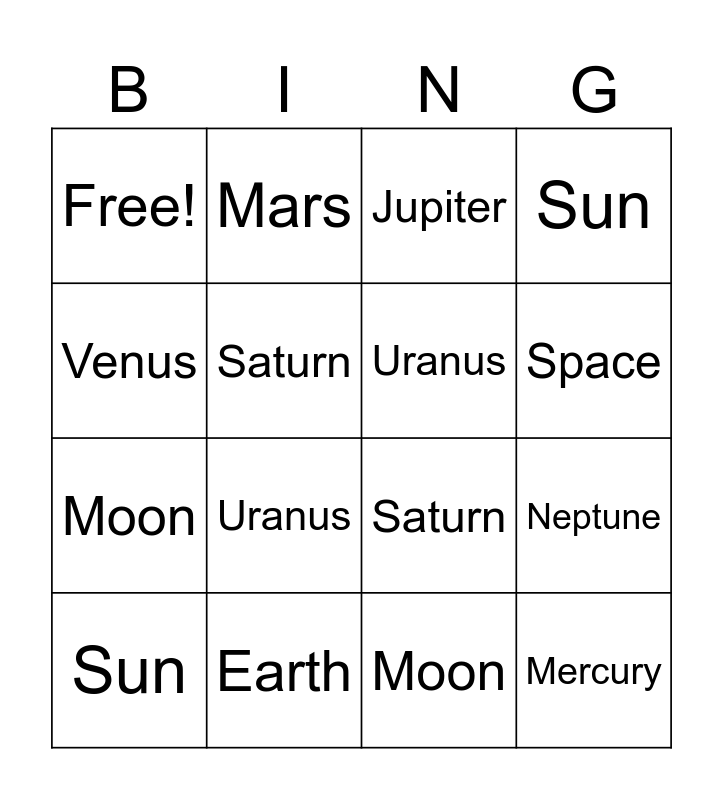 This bingo card has 23 words: Mercury, Jupiter, Space, Earth, Venus, Free!, Saturn, Mars, Sun, Mercury, Venus, Earth, Mars, Jupiter, Saturn, Uranus, Neptune, Sun, Moon, Stars, Uranus, Moon, Mercury, Venus, Earth, Mars, Jupiter, Saturn, Uranus, Neptune, Sun, Moon and Stars.