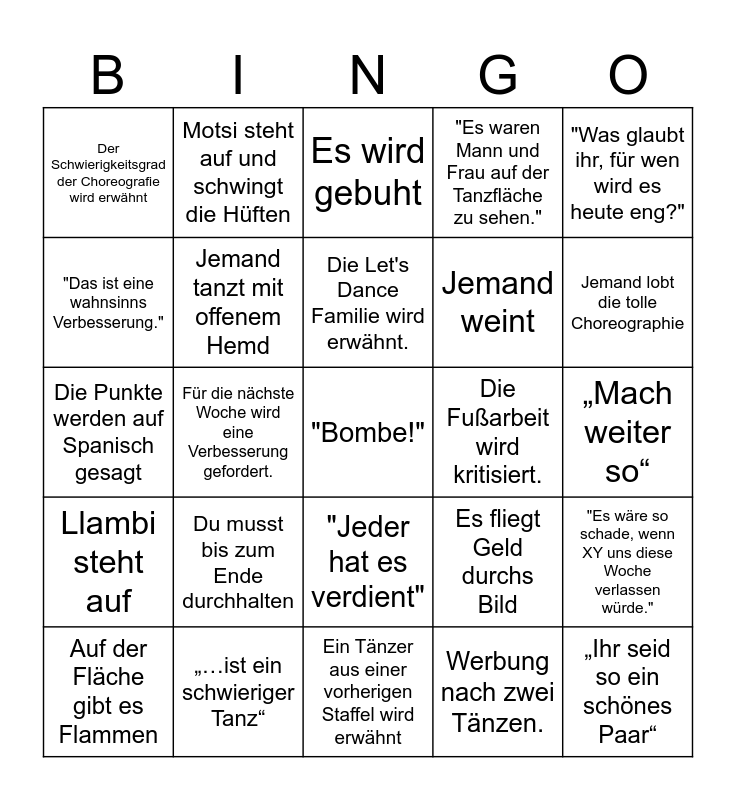 This bingo card has 48 words: Free!, "Bombe!", "Sexy Chico/Chica", Ein Tänzer aus einer vorherigen Staffel wird erwähnt, Du musst bis zum Ende durchhalten, Llambi vergibt nur einen Punkt, Motsi steht auf und schwingt die Hüften, Daniel und Llambi liefern sich ein Wortgefecht, "Das ist eine wahnsinns Verbesserung.", Motsi wird emotional, Jemand tanzt mit offenem Hemd, "Es waren Mann und Frau auf der Tanzfläche zu sehen.", "Es wäre so schade, wenn XY uns diese Woche verlassen würde.", Es fliegt Geld durchs Bild, Llambi lacht über einen Witz von Daniel., Das Aussehen der Frauen wird thematisiert., Die Let's Dance Familie wird erwähnt., Die Fußarbeit wird kritisiert., Die Jury macht eine Prognose fürs Finale., "Was glaubt ihr, für wen wird es heute eng?", Für die nächste Woche wird eine Verbesserung gefordert., Werbung nach zwei Tänzen., Der Schwierigkeitsgrad der Choreografie wird erwähnt, Jemand weint, Es wird über Hüfte geredet, Jemand lobt die tolle Choreographie, Auf der Fläche gibt es Flammen, Es wird die Let's Dance Tour beworben, "Jeder hat es verdient", Llambi steht auf, Es gibt Standing Ovation, Die Haltung wird kritisiert, Die Charakteristik des Tanzes wird angesprochen, „Hier in Köln Ossendorf“, „…ist ein schwieriger Tanz“, „Ich habe mein bestes gegeben“, Kreativer Kelleneinsatz, „Mach weiter so“, Die Endpositionen werden kritisiert, Die Arme werden kritisiert, Das Rhythmusgefühl wird gelobt, „Ihr seid so ein schönes Paar“, Es wird gebuht, Die Ausstrahlung wird gelobt, Die Punkte werden auf Spanisch gesagt, Das Let’s-Dance Bett wird eingesetzt, „Ich will mehr davon“ and „mir hat sehr gut gefallen“.