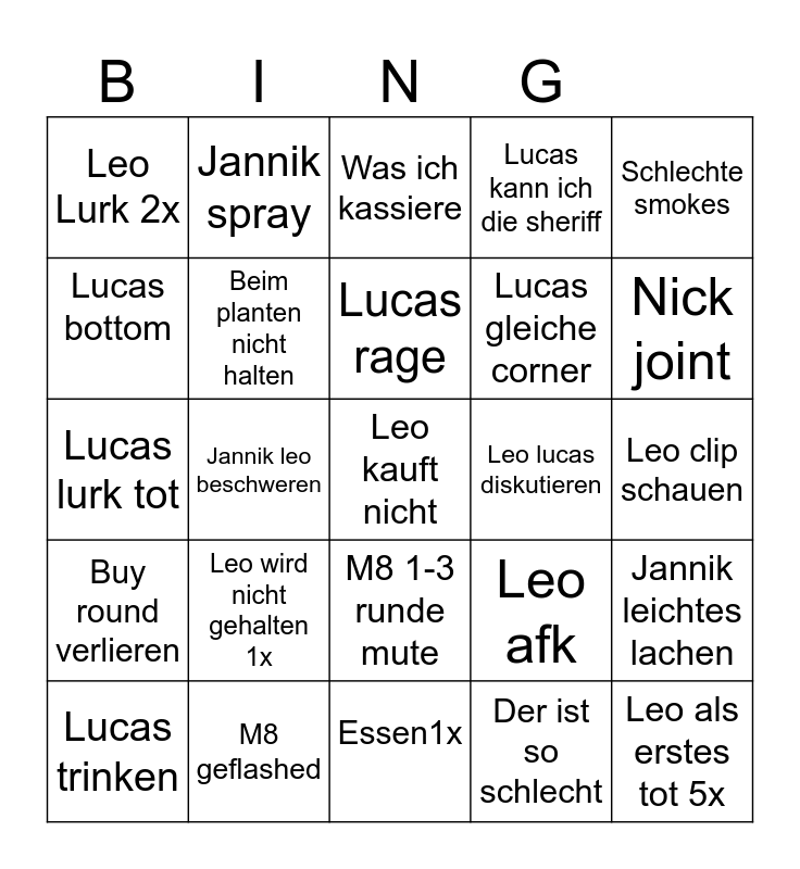 This bingo card has 25 words: Leo wird nicht gehalten 1x, Essen1x, Lucas rage, Lucas trinken, Schlechte smokes, Leo Lurk 2x, Lucas bottom, Jannik spray, Leo lucas diskutieren, M8 1-3 runde mute, Lucas gleiche corner, Lucas lurk tot, Leo afk, Jannik leichtes lachen, Beim planten nicht halten, Leo als erstes tot 5x, Leo clip schauen, Was ich kassiere, Nick joint, Jannik leo beschweren, Leo kauft nicht, M8 geflashed, Buy round verlieren, Lucas kann ich die sheriff and Der ist so schlecht.