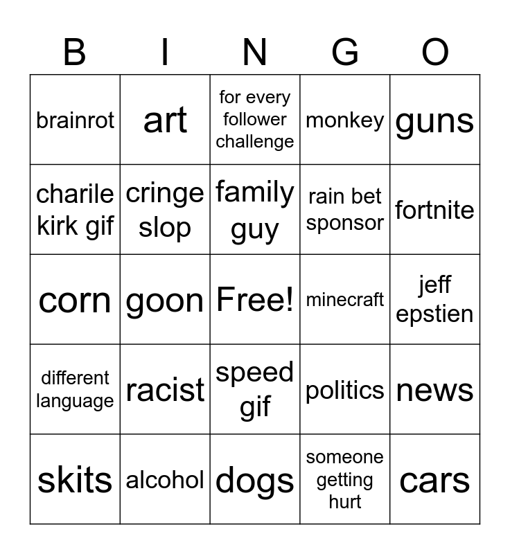 This bingo card has a free space and 24 words: racist, alcohol, family guy, skits, guns, brainrot, charile kirk gif, art, minecraft, speed gif, rain bet sponsor, corn, politics, news, cringe slop, someone getting hurt, jeff epstien, for every follower challenge, fortnite, goon, cars, different language, monkey and dogs.