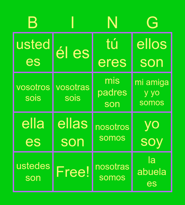 This bingo card has 16 words: Free!, yo soy, tú eres, usted es, ella es, él es, nosotros somos, nosotras somos, vosotros sois, vosotras sois, ustedes son, ellos son, ellas son, mi amiga y yo somos, mis padres son and la abuela es.