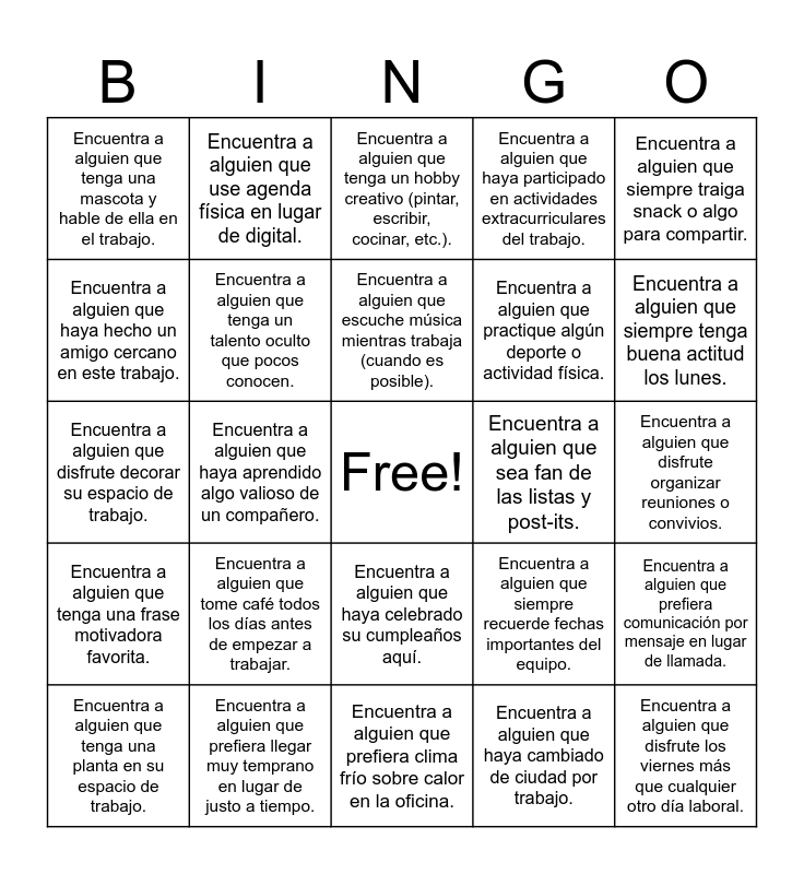 This bingo card has a free space and 24 words: Encuentra a alguien que tome café todos los días antes de empezar a trabajar., Encuentra a alguien que prefiera llegar muy temprano en lugar de justo a tiempo., Encuentra a alguien que escuche música mientras trabaja (cuando es posible)., Encuentra a alguien que tenga una planta en su espacio de trabajo., Encuentra a alguien que siempre traiga snack o algo para compartir., Encuentra a alguien que tenga una mascota y hable de ella en el trabajo., Encuentra a alguien que haya hecho un amigo cercano en este trabajo., Encuentra a alguien que use agenda física en lugar de digital., Encuentra a alguien que sea fan de las listas y post-its., Encuentra a alguien que haya celebrado su cumpleaños aquí., Encuentra a alguien que practique algún deporte o actividad física., Encuentra a alguien que disfrute decorar su espacio de trabajo., Encuentra a alguien que siempre recuerde fechas importantes del equipo., Encuentra a alguien que prefiera comunicación por mensaje en lugar de llamada., Encuentra a alguien que tenga un talento oculto que pocos conocen., Encuentra a alguien que haya cambiado de ciudad por trabajo., Encuentra a alguien que disfrute organizar reuniones o convivios., Encuentra a alguien que tenga un hobby creativo (pintar, escribir, cocinar, etc.)., Encuentra a alguien que siempre tenga buena actitud los lunes., Encuentra a alguien que haya aprendido algo valioso de un compañero., Encuentra a alguien que disfrute los viernes más que cualquier otro día laboral., Encuentra a alguien que tenga una frase motivadora favorita., Encuentra a alguien que haya participado en actividades extracurriculares del trabajo. and Encuentra a alguien que prefiera clima frío sobre calor en la oficina..