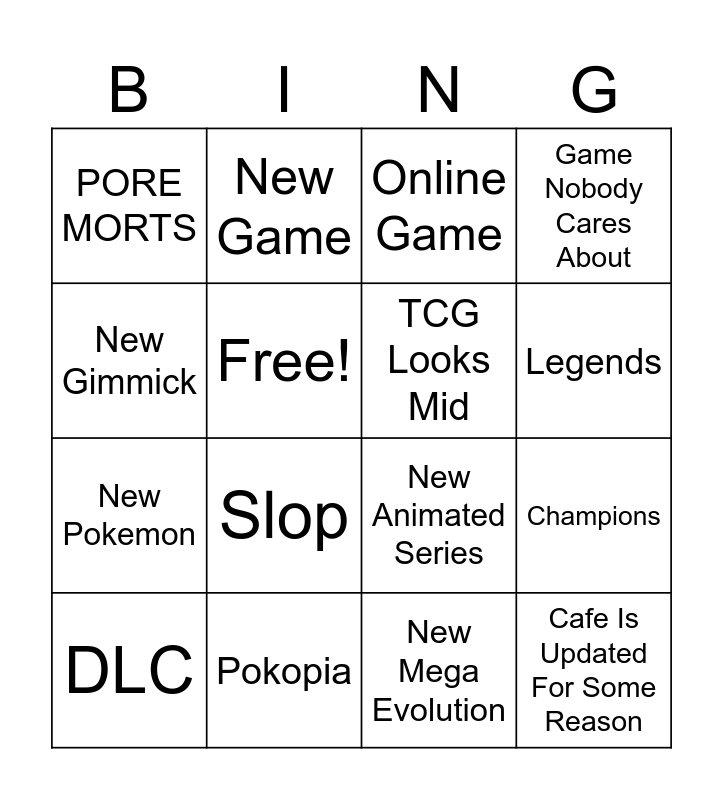 This bingo card has 16 words: Pokopia, Champions, Online Game, PORE MORTS, New Pokemon, New Game, New Animated Series, New Mega Evolution, New Gimmick, Free!, DLC, Game Nobody Cares About, Slop, Legends, TCG Looks Mid and Cafe Is Updated For Some Reason.