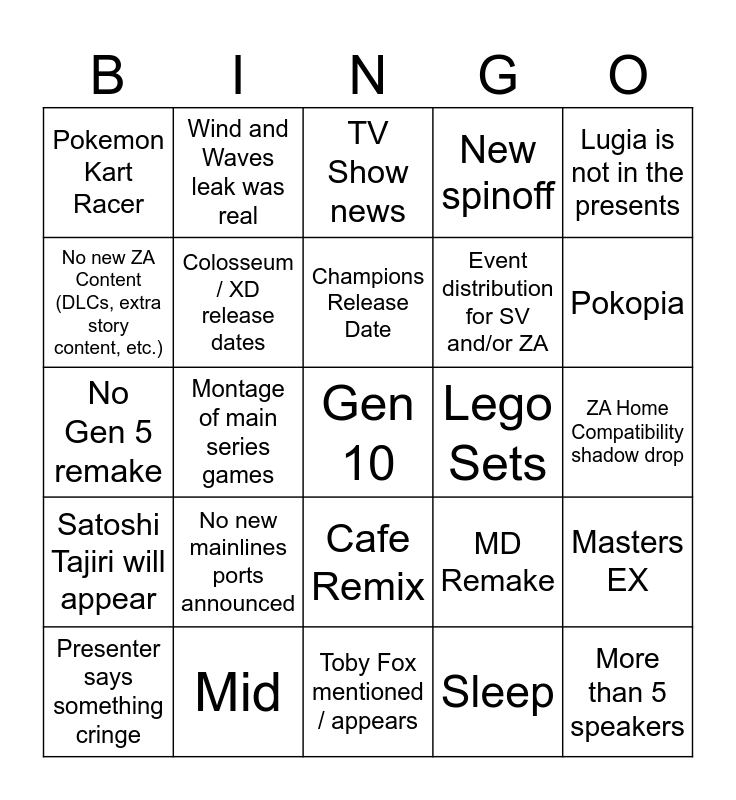This bingo card has a free space and 24 words: No new mainlines ports announced, Mid, Champions Release Date, Presenter says something cringe, Lugia is not in the presents, Pokemon Kart Racer, No new ZA Content (DLCs, extra story content, etc.), Wind and Waves leak was real, Lego Sets, Cafe Remix, Event distribution for SV and/or ZA, No Gen 5 remake, MD Remake, Masters EX, Colosseum / XD release dates, Sleep, ZA Home Compatibility shadow drop, TV Show news, Pokopia, Montage of main series games, More than 5 speakers, Satoshi Tajiri will appear, New spinoff and Toby Fox mentioned / appears.