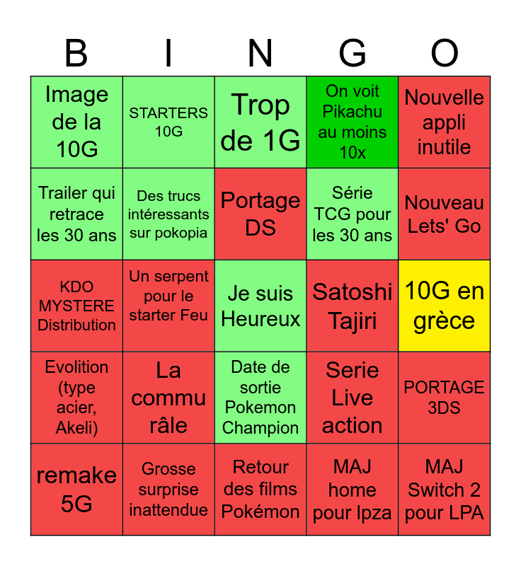 This bingo card has a free space and 24 words: remake 5G, La commu râle, Portage DS, MAJ home pour lpza, Nouvelle appli inutile, Image de la 10G, STARTERS 10G, Trop de 1G, Satoshi Tajiri, 10G en grèce, KDO MYSTERE Distribution, Des trucs intéressants sur pokopia, Serie Live action, PORTAGE 3DS, Trailer qui retrace les 30 ans, Grosse surprise inattendue, Retour des films Pokémon, On voit Pikachu au moins 10x, Nouveau Lets' Go, Evolition (type acier, Akeli), Un serpent pour le starter Feu, Date de sortie Pokemon Champion, Série TCG pour les 30 ans and MAJ Switch 2 pour LPA.