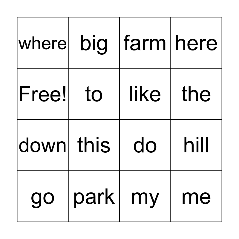 This bingo card has 16 words: park, hill, farm, where, down, big, do, my, Free!, to, go, here, this, the, like and me.