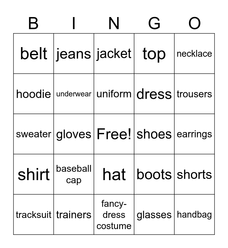 This bingo card has a free space and 27 words: boots, coat, dress, fancy-dress costume, hoodie, jacket, jeans, shirt, shoes, shorts, sweater, top, tracksuit, trainers, trousers, T-shirt, underwear, uniform, baseball cap, belt, earrings, glasses, gloves, handbag, hat, necklace and scarf.