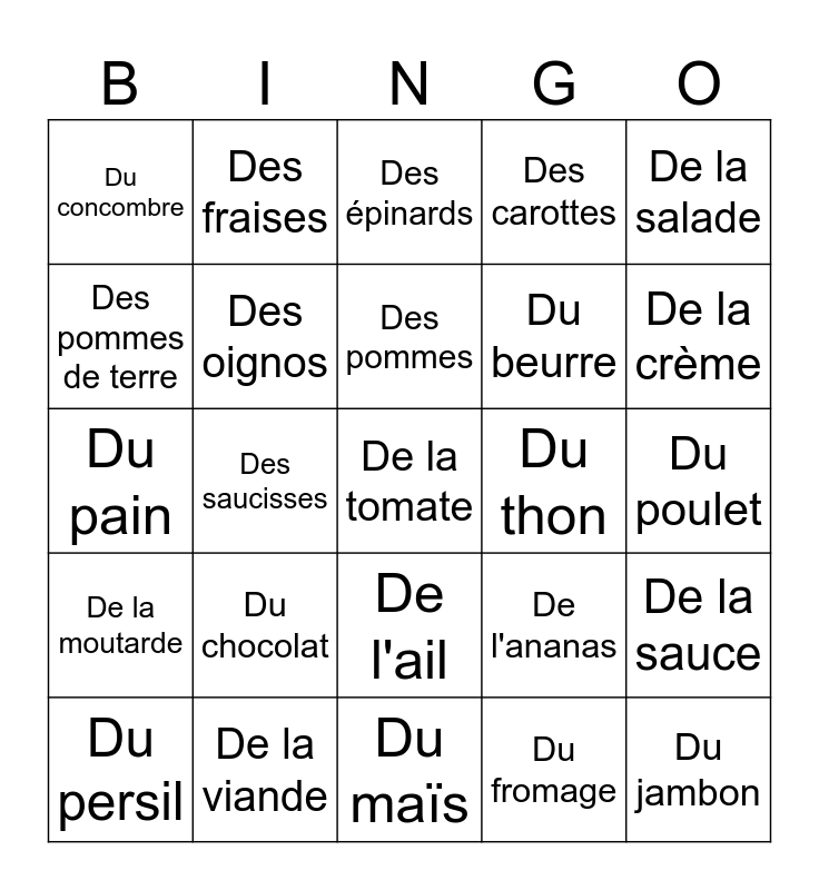 This bingo card has a free space and 24 words: Du chocolat, De la viande, Des pommes, Du persil, De la salade, Du concombre, Des pommes de terre, Des fraises, Du thon, De l'ail, Du beurre, Du pain, De l'ananas, De la sauce, Des oignos, Du fromage, Du poulet, Des épinards, De la crème, Des saucisses, Du jambon, De la moutarde, Des carottes and Du maïs.