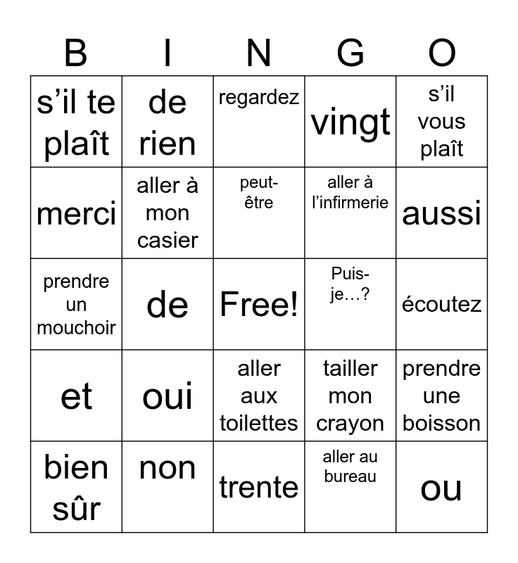 This bingo card has a free space and 24 words: oui, non, peut-être, bien sûr, s’il vous plaît, s’il te plaît, merci, de rien, Puis-je…?, aller aux toilettes, aller à l’infirmerie, prendre un mouchoir, tailler mon crayon, prendre une boisson, aller à mon casier, aller au bureau, écoutez, regardez, aussi, de, ou, et, vingt and trente.