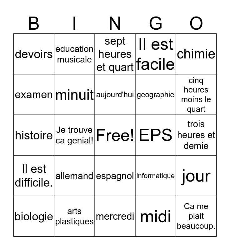 This bingo card has a free space and 24 words: allemand, arts plastiques, aujourd'hui, biologie, chimie, devoirs, examen, education musicale, EPS, espagnol, geographie, histoire, informatique, jour, minuit, midi, trois heures et demie, sept heures et quart, cinq heures moins le quart, Je trouve ca genial!, Ca me plait beaucoup., Il est difficile., Il est facile and mercredi.