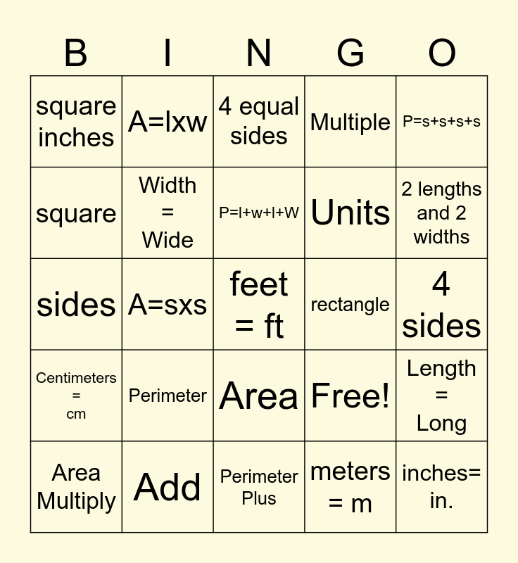 This bingo card has 25 words: Perimeter, Perimeter Plus, P=l+w+l+W, Area Multiply, P=s+s+s+s, square inches, square, A=lxw, rectangle, Area, Units, sides, Free!, Length = Long, Width = Wide, inches= in., 4 sides, 4 equal sides, 2 lengths and 2 widths, A=sxs, feet = ft, Add, Centimeters = cm, Multiple and meters = m.