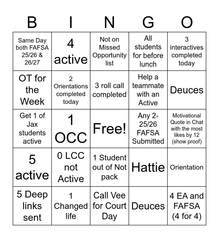 This bingo card has a free space and 34 words: 70% Engagement by 3pm, Deuces, Have on a Green shirt, 2 IAF completed today, 5 active, 2 Orientations completed today, 3 interactives completed today, 5 Deep links sent, 4 active, Show 5 EA approved love, 3 roll call completed, Not on Missed Opportunity list, Any 25/26 FAFSA Sub, Any Both 25/26 & 26/27 FAFSA Sub, Any 2-25/26 FAFSA Submitted, Deuces, 1 Changed life, Get 1 of Jax students active, 0 LCC not Active, Hattie, 1 Student out of Not pack, Same day FAFSA 25/26 FAFSA, Same Day both FAFSA 25/26 & 26/27, Motivational Quote in Chat with the most likes by 12 (show proof), Call Vee for Court Day, 4 EA and FAFSA (4 for 4), All students for before lunch, 4 ME 1000 sessions, Help a teammate with an Active, OT for the Week, Stitch OT for the week, 1 OCC, Orientation and 2 OCC.