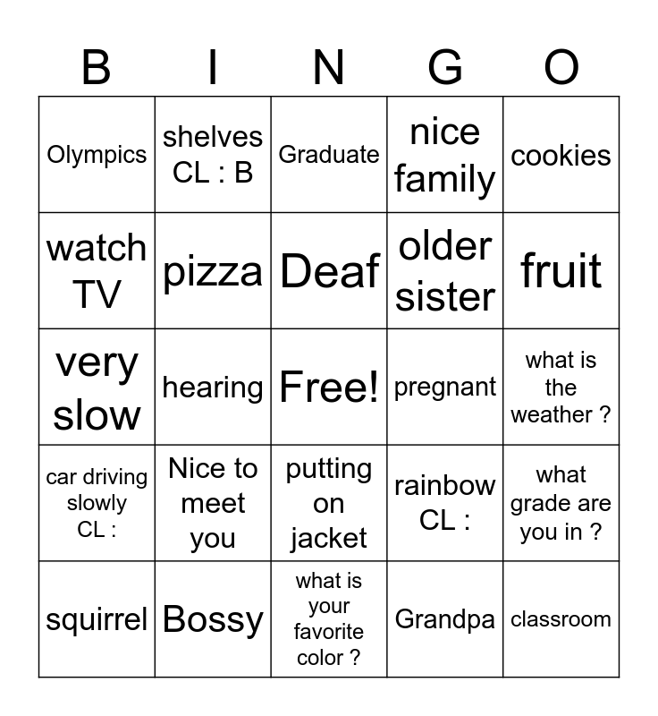 This bingo card has a free space and 24 words: Nice to meet you, Bossy, Deaf, squirrel, cookies, Olympics, watch TV, shelves CL : B, pregnant, putting on jacket, older sister, very slow, rainbow CL :, what grade are you in ?, pizza, Grandpa, what is the weather ?, Graduate, fruit, hearing, classroom, car driving slowly CL :, nice family and what is your favorite color ?.