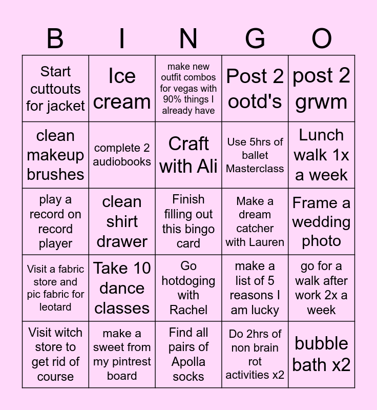 This bingo card has a free space and 24 words: Take 10 dance classes, make a sweet from my pintrest board, Craft with Ali, Visit witch store to get rid of course, post 2 grwm, Start cuttouts for jacket, clean makeup brushes, Ice cream, Make a dream catcher with Lauren, Go hotdoging with Rachel, Use 5hrs of ballet Masterclass, play a record on record player, make a list of 5 reasons I am lucky, go for a walk after work 2x a week, complete 2 audiobooks, Do 2hrs of non brain rot activities x2, Frame a wedding photo, make new outfit combos for vegas with 90% things I already have, Lunch walk 1x a week, clean shirt drawer, bubble bath x2, Visit a fabric store and pic fabric for leotard, Post 2 ootd's and Find all pairs of Apolla socks.
