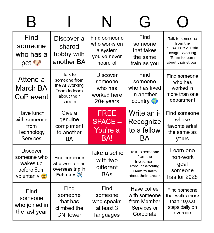 This bingo card has 1 images, a free space and 24 words: Find someone who went on an overseas trip in February ✈️, Find someone that has climbed the CN Tower, Discover someone who has worked here 20+ years, Find someone who joined in the last year, Talk to someone from the Snowflake & Data Insight Working Team to learn about their stream, Find someone who has a pet 🐶, Attend a March BA CoP event, Discover a shared hobby with another BA, Write an i-Recognize to a fellow BA, Take a selfie with two different BAs, Find someone who has lived in another country 🌍, Have lunch with someone from Technology Services, Talk to someone from the Investment Product Working Team to learn about their stream, Learn one non-work goal someone has for 2026, Talk to someone from the AI Working Team to learn about their stream, Have coffee with someone from Member Services or Corporate, Find someone whose favorite artist the same as yours, Find someone who works on a system you’ve never heard of, Find someone who has worked in more than one department, Give a genuine compliment to another BA, Find someone that walks more than 10,000 steps daily on average, Discover someone who wakes up before 6am voluntarily 😅, Find someone that takes the same train as you and Find someone who speaks at least 3 languages.