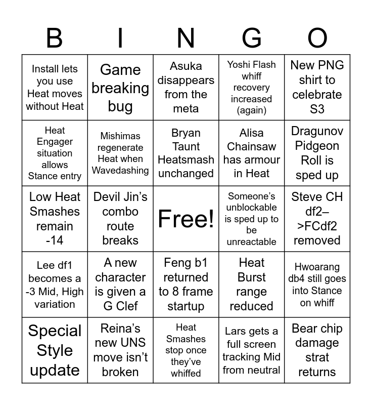 This bingo card has a free space and 24 words: A new character is given a G Clef, Reina’s new UNS move isn’t broken, Bryan Taunt Heatsmash unchanged, Special Style update, New PNG shirt to celebrate S3, Install lets you use Heat moves without Heat, Heat Engager situation allows Stance entry, Game breaking bug, Someone’s unblockable is sped up to be unreactable, Feng b1 returned to 8 frame startup, Alisa Chainsaw has armour in Heat, Low Heat Smashes remain -14, Heat Burst range reduced, Hwoarang db4 still goes into Stance on whiff, Mishimas regenerate Heat when Wavedashing, Lars gets a full screen tracking Mid from neutral, Steve CH df2–>FCdf2 removed, Asuka disappears from the meta, Dragunov Pidgeon Roll is sped up, Devil Jin’s combo route breaks, Bear chip damage strat returns, Lee df1 becomes a -3 Mid, High variation, Yoshi Flash whiff recovery increased (again) and Heat Smashes stop once they’ve whiffed.